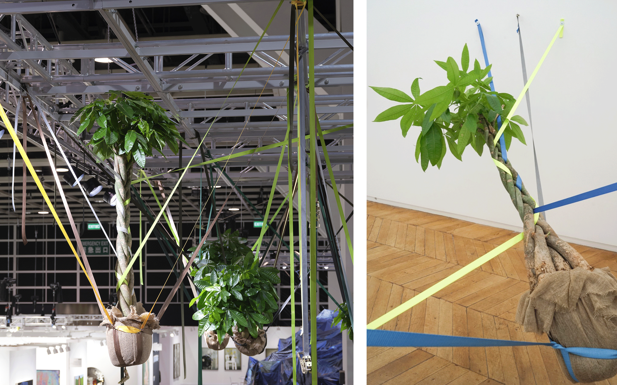 '나는 상징의 의미를 파괴하는 데 관심이 있습니다. 사람들이 예술 작품을 읽을 때 그것을 은유로 읽는 경우가 많기 때문입니다.'라고 작가는 계속 이야기한다. 이는 그의 작업 전반에 걸쳐 식물이 은유적으로 기능하는 방식을 생각하면 다소 놀라운 일이다. 노란색과 파란색 래치드 스트랩을 사용하여 홍콩을 정지시킨 2018년 '슈퍼 태풍' 망쿳(Mangkhut)을 연상시키는 다섯 그루의 파치라 아쿠아티카( Pachira aquatica ) 나무를 함께 엮은 돈나무를 수평으로 매달아 놓은 Suspended Mr Cuddles (2019)를 살펴보세요. 또는 Mr. Cuddles Under the Eave (2021)는 13개의 돈나무를 끈으로 천장에 매달아 느슨하게 거꾸로 된 피라미드를 형성하는 방식으로 코로나 봉쇄 경험에 반응한다.