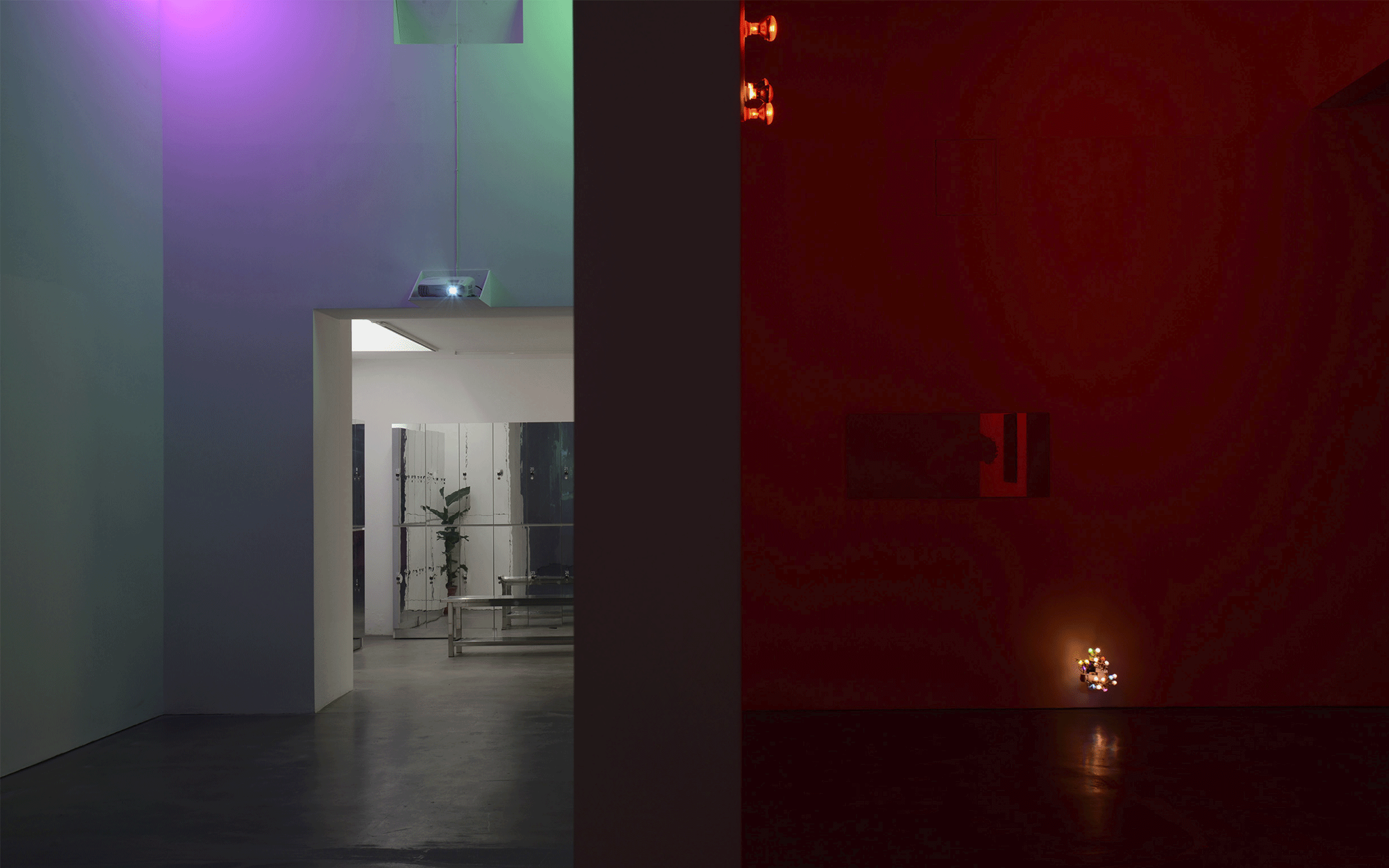 참나무, 사향, 흙, 이끼의 향기가 가득한 나무다. 냄새는 The Helping Hand를 다시 호출하는 쇼의 정의 요소다., 2018년 베니스 건축 비엔날레 기간 동안 크루징 파빌리온(Cruising Pavilion) 전시회에 설치된 미스트 머신인 영(Yeung)은 게이 목욕탕에서 체취를 가리기 위해 사용하는 향수에 경의를 표하기 위해 유칼립투스 오일을 기화시켰다. '전시는 어둡기 때문에 향기에 의존한다. 그것이 크루즈이기 때문이다'라고 Yeung은 설명한다. '밤에 숲에 가면 시야가 제한되어 감각이 고조됩니다.' 칠해진 벽은 이 감각적 강화를 증폭시키며, 이 벽의 색조는 방의 유일한 광원인 파충류 동식물 사육장의 야간 조건을 재현하는 데 사용되는 달빛 열 램프에 의해 음소거된다. "실제 색상을 확신할 수 없기 때문에 인식을 조작할 수 있다는 생각입니다"라고 Yeung은 말한다. 그래서 이번 벽화 시리즈의 제목은 '가스라이팅'이다.