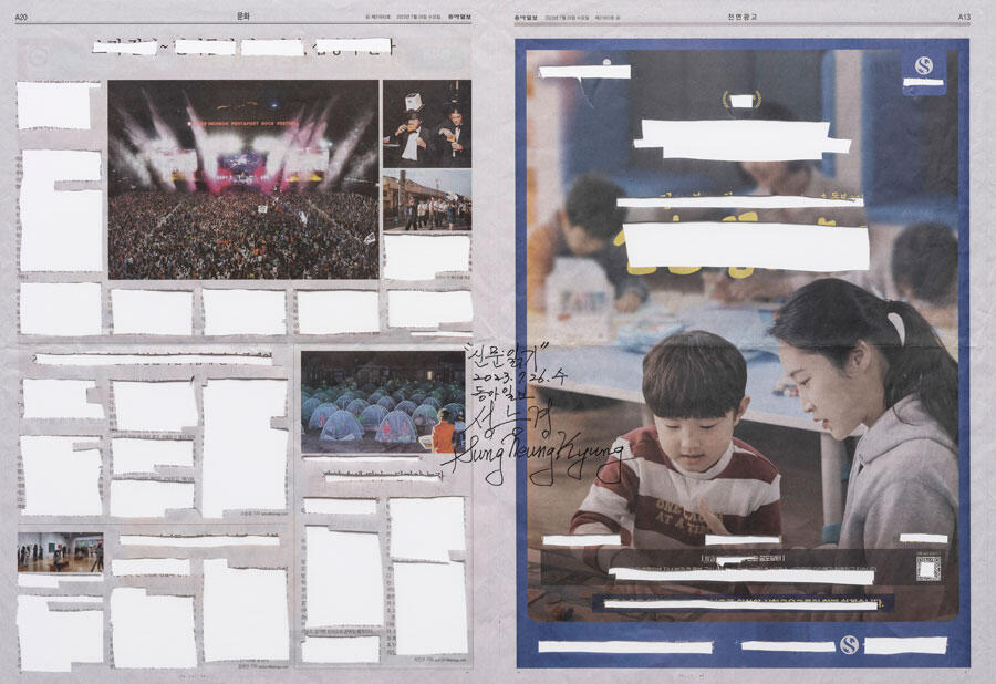 성능경, 신문을 읽는다. 2023, 신문, 79cm x 55 cm. 제공: 작가 및 갤러리현대