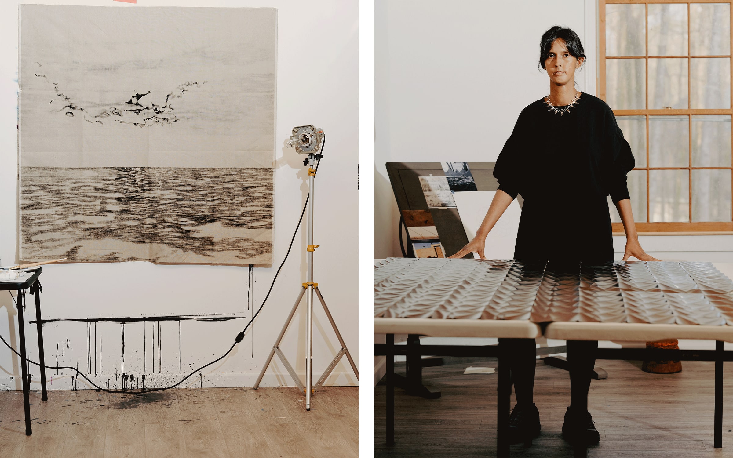 대규모로 조립할 때, Sultana는 보이지 않는 손의 개념에 동의하지 않을 수 있다. 그녀는 흑연으로 작업할 때 필연적으로 나타나는 엄지와 손가락 자국을 지적한다. 릴번 스튜디오에서는 작품을 스크린으로 볼 때도, 심지어 갤러리 환경에서도 일어나지 않는 기이한 현상이 일어난다. 최근 폭풍의 회청색 빛이 스튜디오 창을 통해 들어오고 단단하고 금속성에서 섬세하고 빛나는 모양으로 변화하는 방식으로 흑연을 비춘다. 빛이 재료와 상호 작용하는 그 순간은 모순에 대한 Sultana의 탐구를 강조한다. 부드러운 것은 단단해지고, 가벼운 것은 무거워져서 다시 돌아온다.