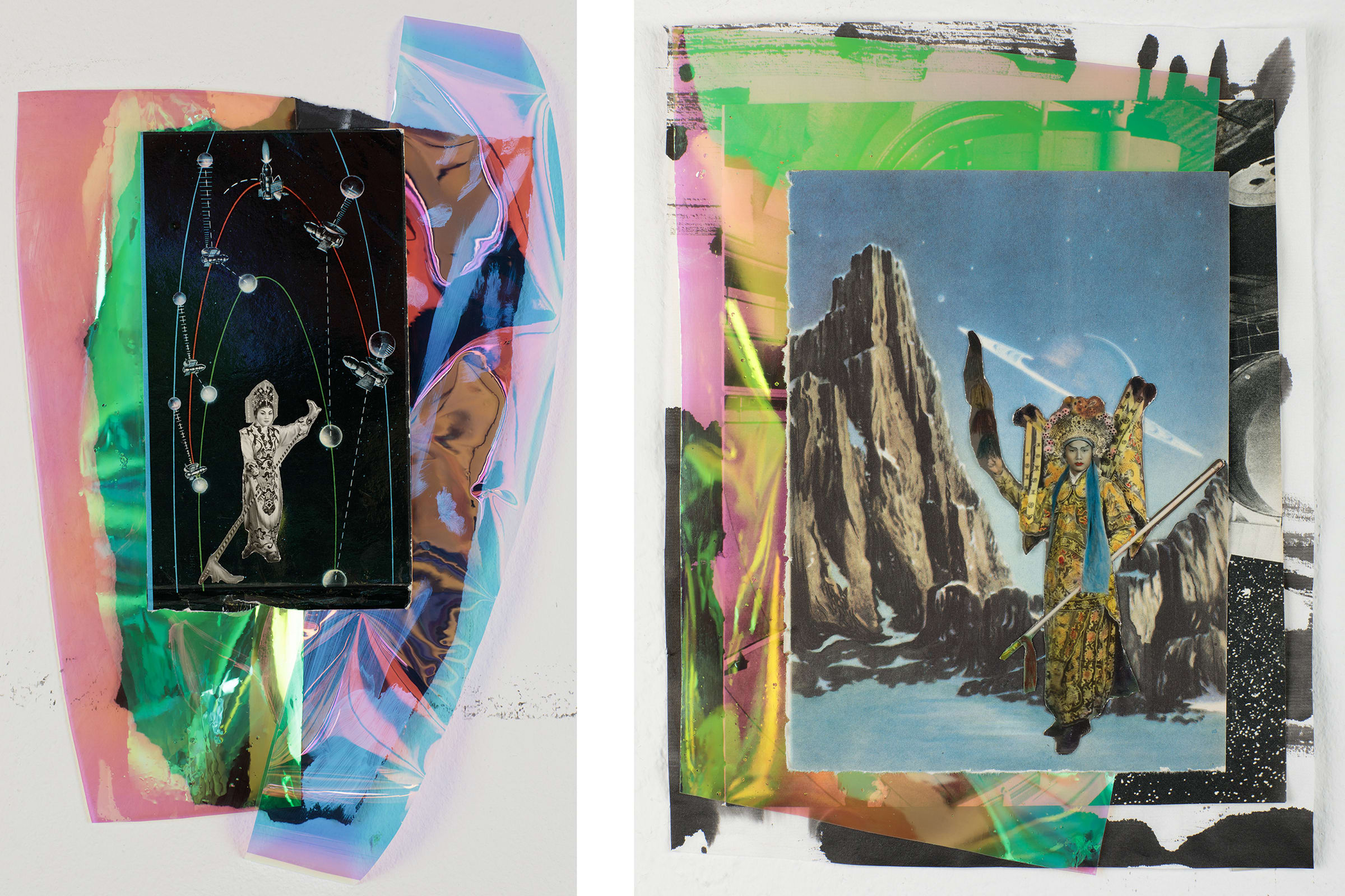 ~ 안에 와양 우주선 사진(2022)의 4번, 인공위성의 원호는 오단(wu dan) 또는 여성 전사 의 컷아웃을 둘러싸고 있으며, 윤곽이 바뀌는 배경을 배경으로 공간의 키치한 미학과 이데올로기적 맥락을 떠올리게 한다. 나이와 미래의 정의, 레이어링의 과정을 통해 웡은 '미래'의 상상이 어떻게 구축되는가를 사유하고 젠더, 전통, 기술의 교차점에 존재하는 미래성을 수행하는 자신만의 언어를 제안한다.