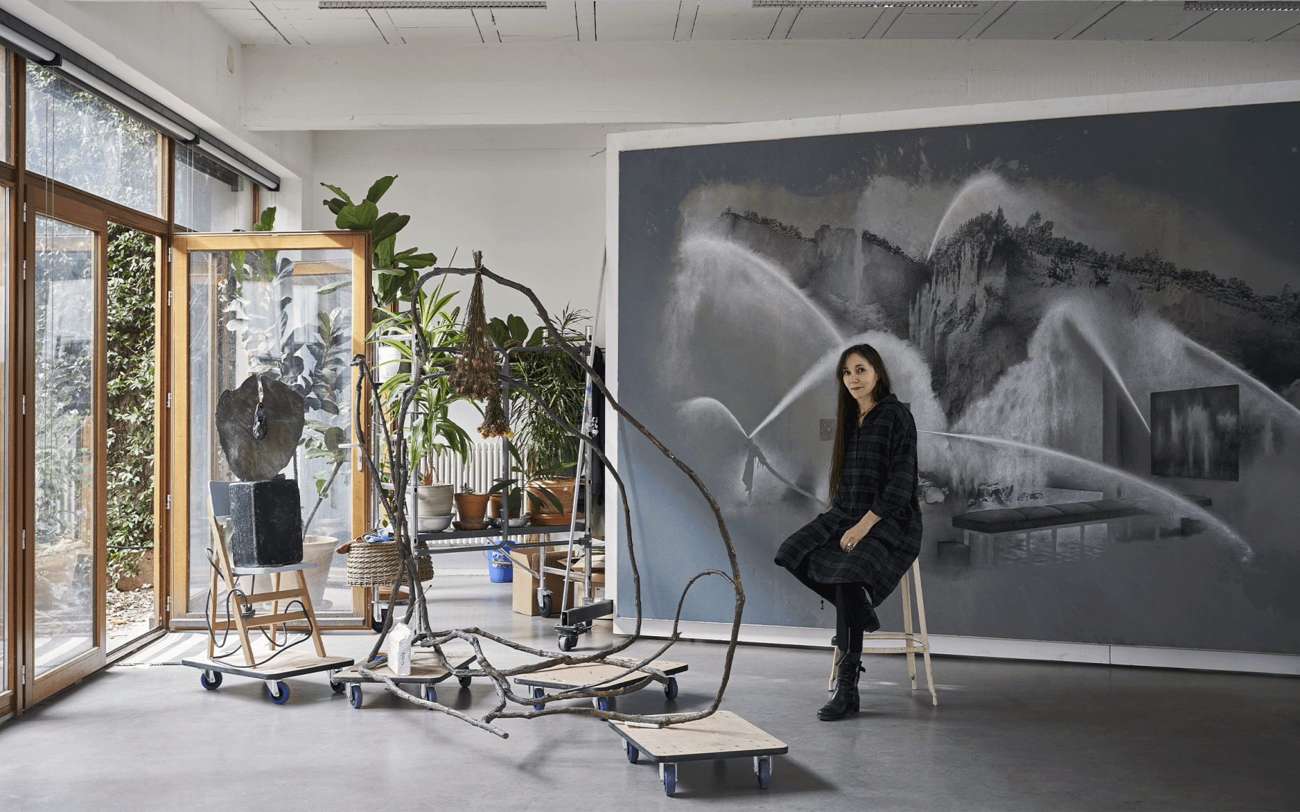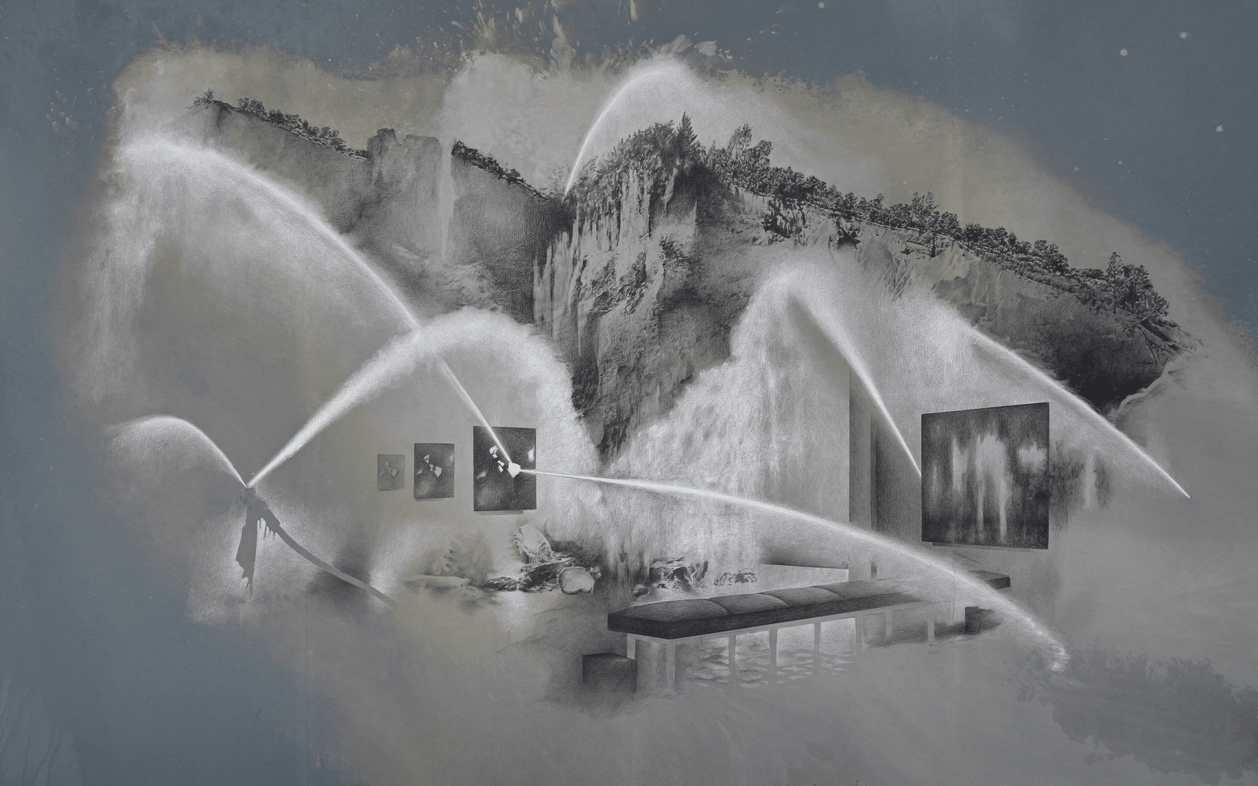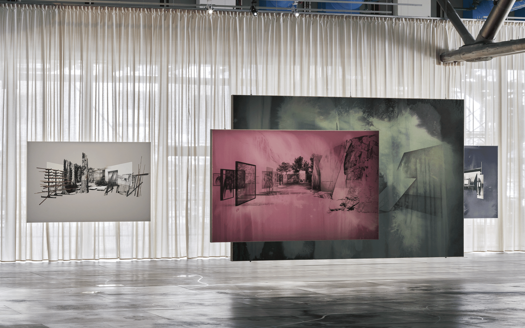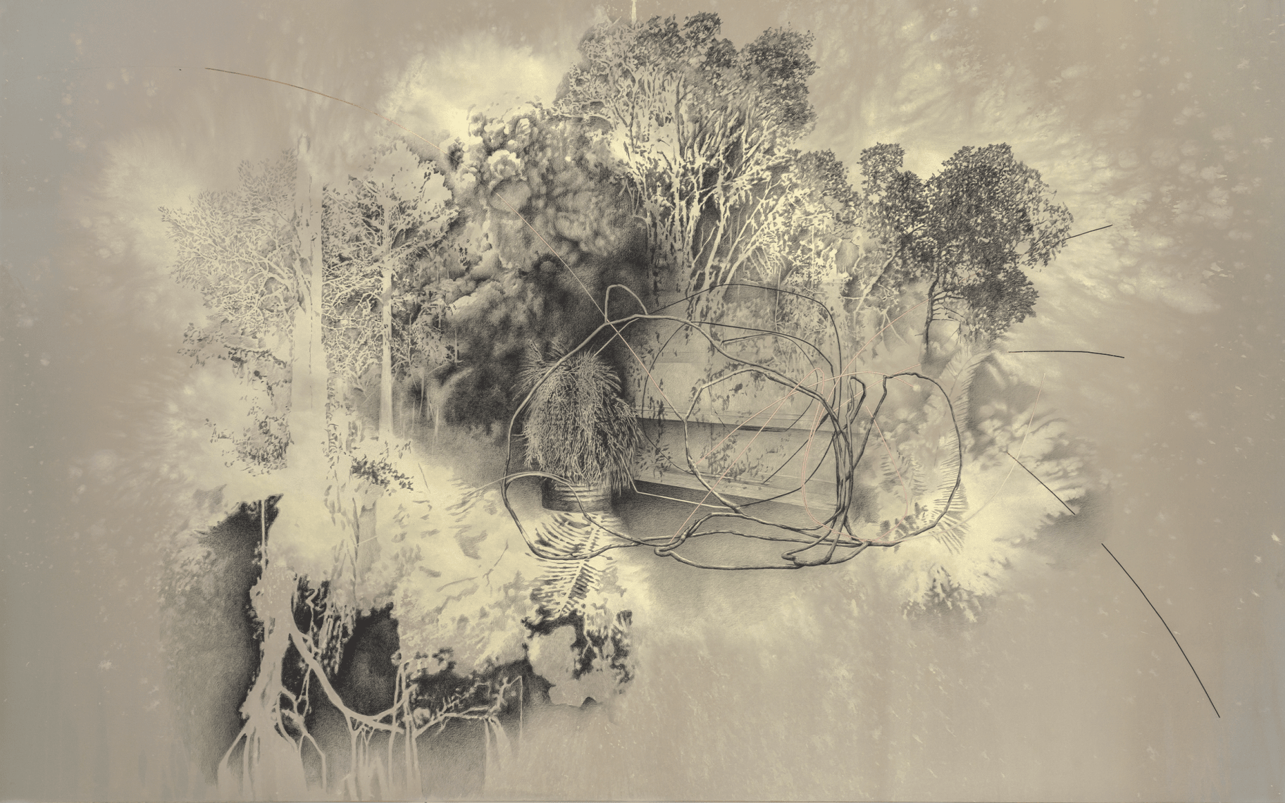 내 전시에서 공간은 매달려 있거나 매달린 드로잉으로 구성되며, 다른 형식은 원근감을 만들고 보는 사람이 시선을 움직이게 하여 측면 비전을 허용한다. 수많은 관점들이 마치 가디언들과 책들을 통해 그대로 시각적으로 표현된다. 나는 호주의 Warlpiri 사람들이 꿈을 일상적인 결정에 통합하고 Dreamtime에 사는 방법을 연구한 인류학자 Barbara Glowczewski의 연구에 매우 관심이 있다. 꿈은 내 작업의 중요한 소재다. 꿈은 시간적 시간성을 따르지 않으며 위계를 부과하지도 않는다. 방문객들이 다양한 수준의 현실에 접근할 수 있기를 바란다.